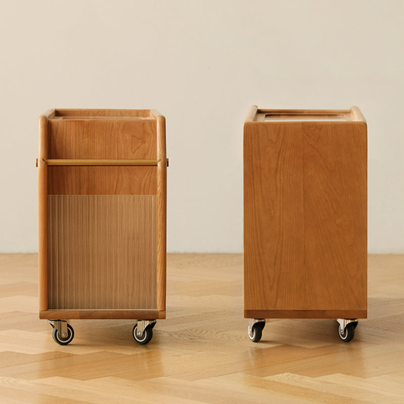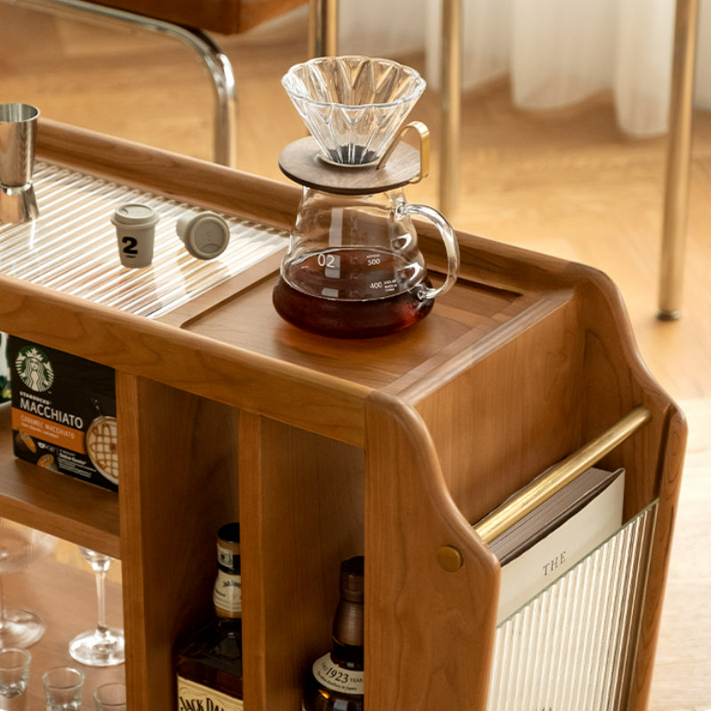 Ce produit polyvalent allie intelligemment les avantages d'un chariot, d'un support de rangement et d'une table d'appoint. Sa structure est entièrement en cerisier de qualité FAS. Le plateau et le présentoir latéral pour magazines sont en verre haute résistance remplaçable. L'espace de rangement central est réglable en taille et en compartimentation. Les quatre roulettes silencieuses situées en bas sont coulissantes et verrouillables pour éviter tout glissement. Placé dans le salon, il peut servir de table basse à côté du canapé, dans la cuisine, de desserte, et dans la chambre, de table de chevet. Envie d'un meuble aussi parfait ?