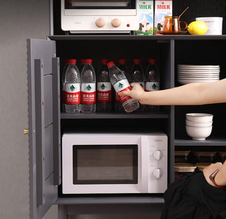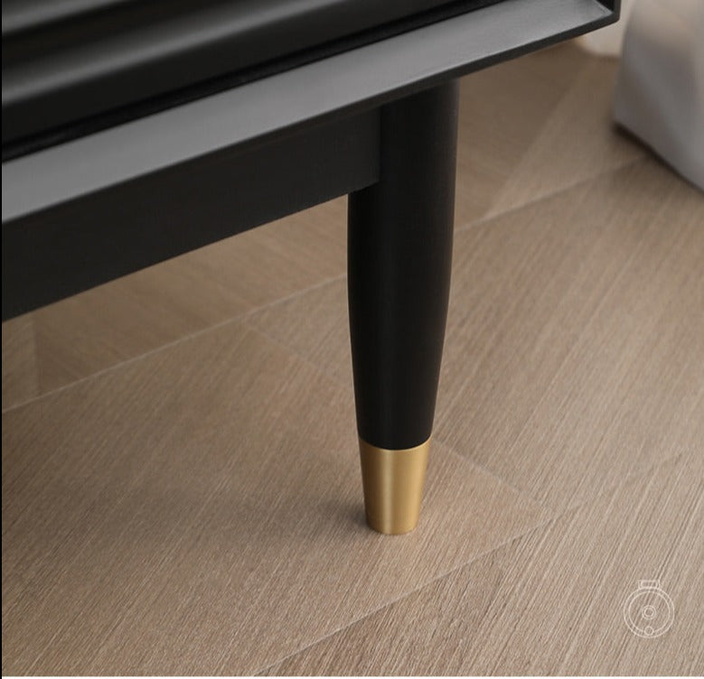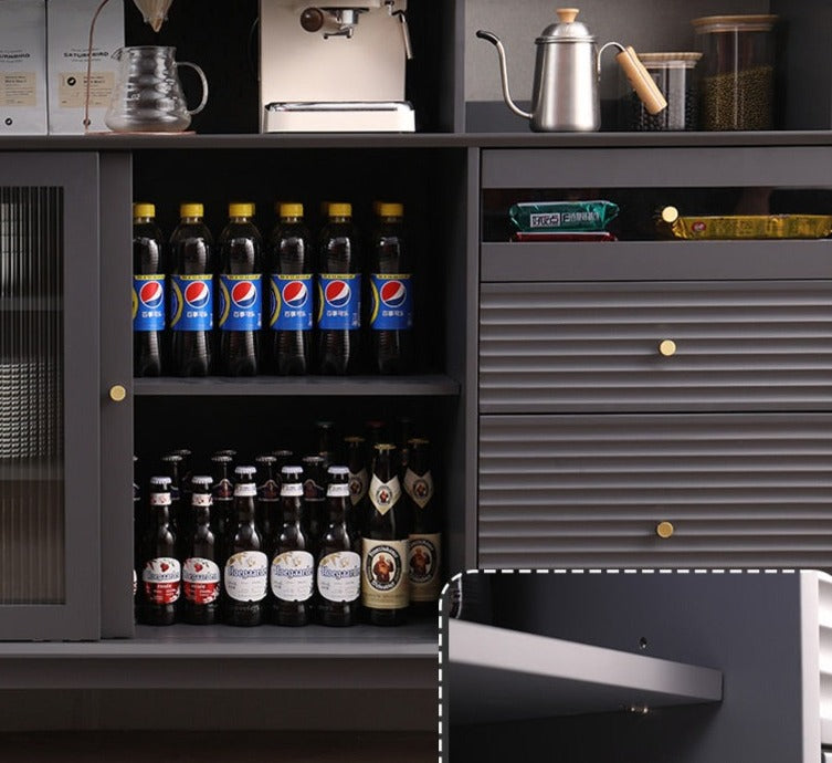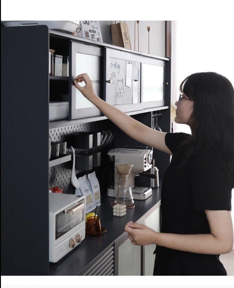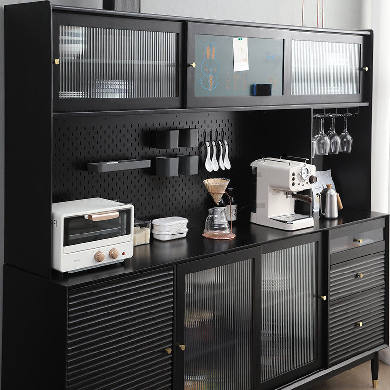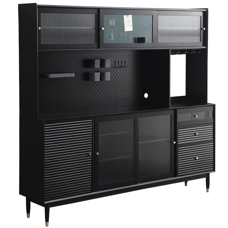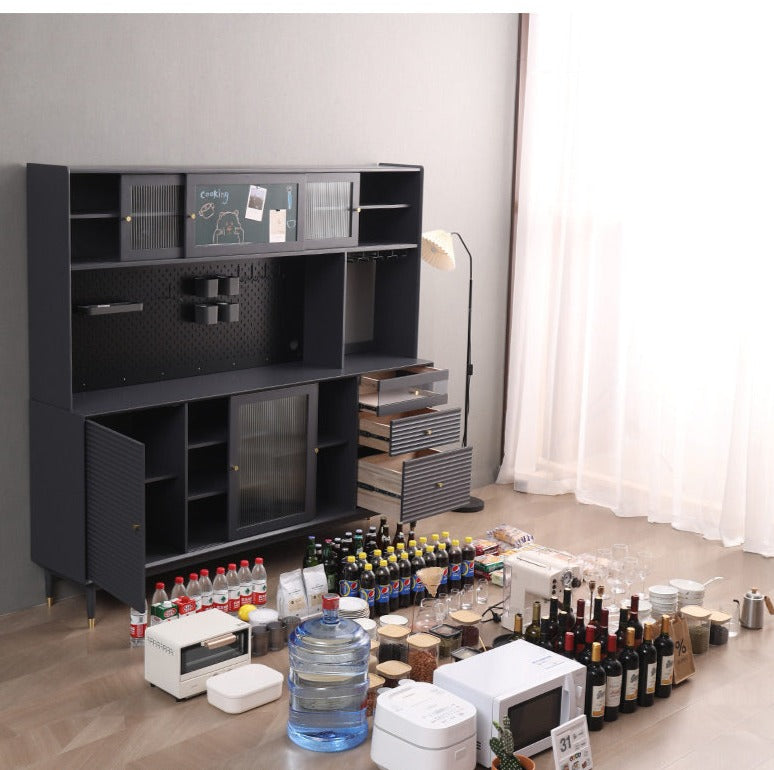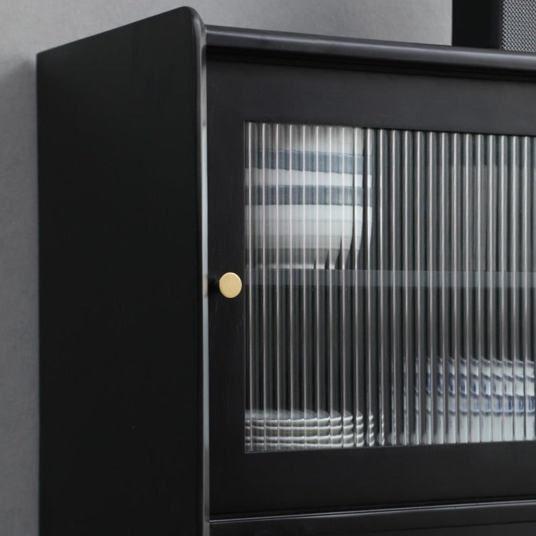 Buffet bahut scandinave Adaline en bois massif. Composé de deux parties (haute et basse) et d'une armoire, ce buffet offre une grande capacité, une sobriété noire luxueuse et moderne, ainsi qu'un grand espace de rangement pour une utilisation polyvalente.