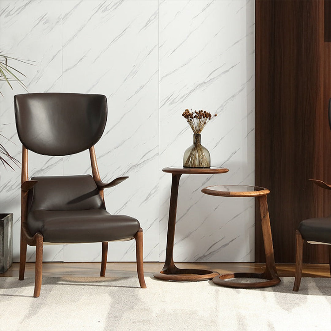 Cette table d'appoint en bois massif incarne le style contemporain. Son design en C, complété par un plateau rond en verre et un piètement annulaire reliés par un seul support, lui confère une esthétique raffinée et s'harmonise parfaitement avec votre fauteuil. Sa finition grainée en noyer noir lui confère une touche rétro et glamour. Placez-y une bouteille de vin précieuse et quelques verres à pied pour une pièce d'une élégance incomparable.