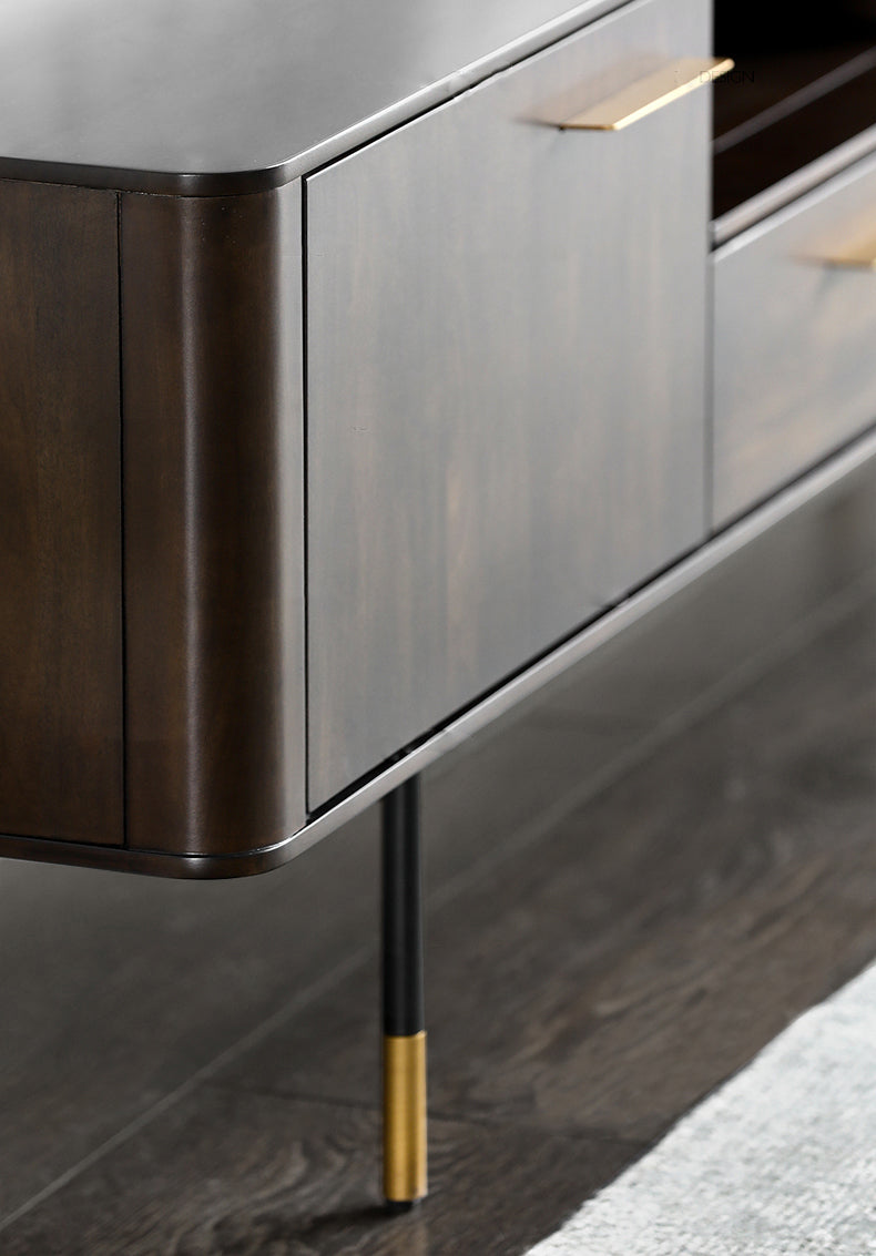 Meuble TV BRINLEY Chicago HILTON en bois massif. Design nordique et luxueux, ce meuble TV en bois massif s'intègre parfaitement au style minimaliste moderne. Idéal pour un appartement ou un salon. À compléter avec la table basse et la commode CHICAGO HILTON de la même collection.