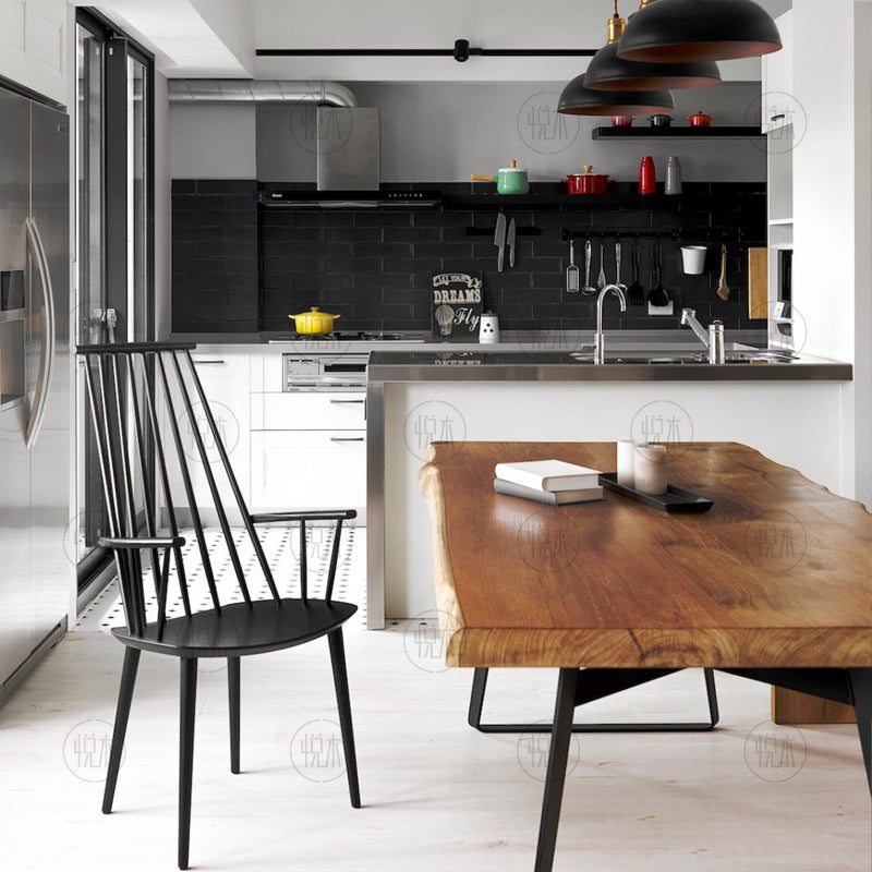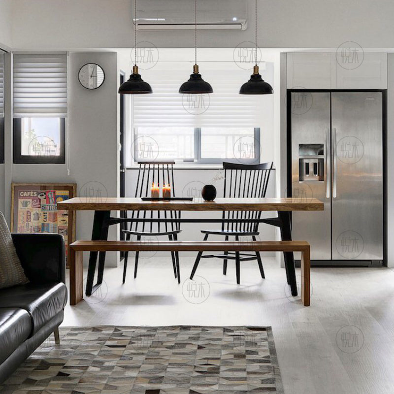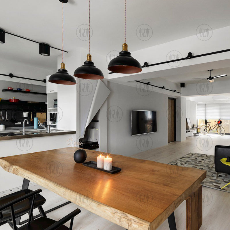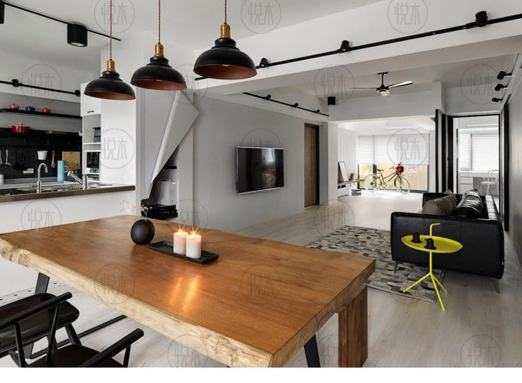 Table de salle à manger FINN en bois massif, design scandinave et nordique, style rétro américain. Bordure naturelle en rondins de bois avec côtés naturels, plateau en bois avec pieds en fer forgé thermolaqué. Convient pour salle à manger, bureau, bureau d'ordinateur, établi ou table de conférence.