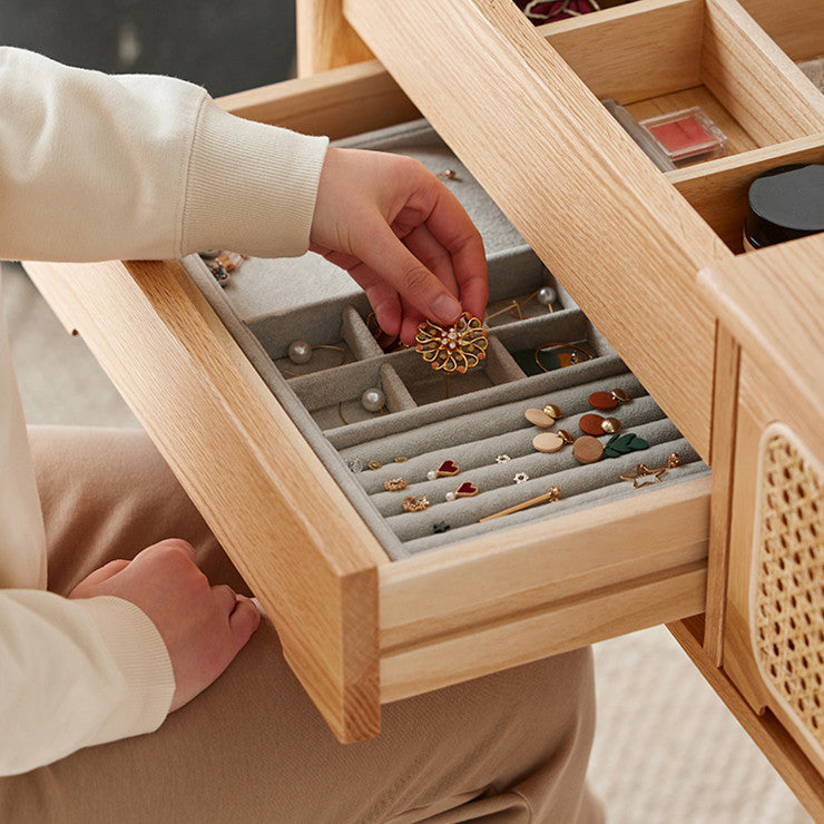 À la recherche d'un ensemble de coiffeuse classique ? Ce tout nouvel ensemble ne vous décevra jamais grâce à sa qualité supérieure, ses fonctionnalités pratiques et son style élégant. La coiffeuse est équipée d'un miroir rabattable pour optimiser l'espace de travail. Lorsque vous ne l'utilisez pas pour vous maquiller, ce bureau polyvalent peut servir de table de chevet ou de bureau. Ses deux tiroirs offrent un grand espace de rangement. De plus, il est doté d'une grille amovible pour séparer les compartiments et organiser vos tiroirs.