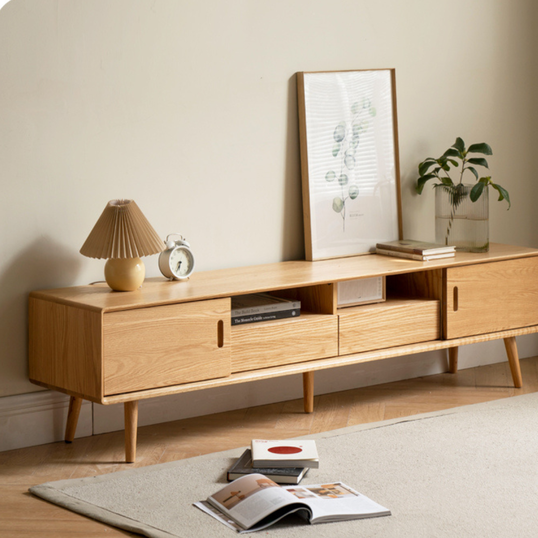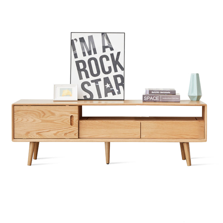 Ce meuble TV rustique allie des tons boisés riches à une silhouette rétro. Fabriqué en chêne, il présente une finition naturelle qui s'harmonise avec toutes les palettes de couleurs. Deux casiers coulissants offrent un grand espace de rangement pour les petits objets. Deux grands tiroirs et un espace de rangement ouvert sont également disponibles, parfaits pour les DVD et autres accessoires de divertissement. Les pieds inclinés et fuselés et les fentes d'aération à l'arrière complètent le design.