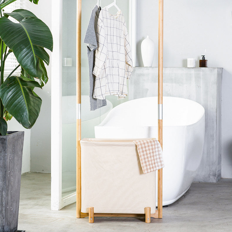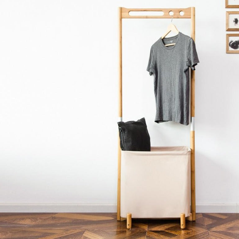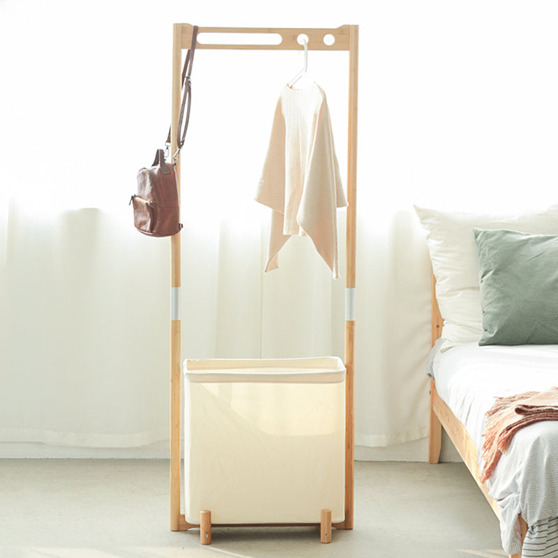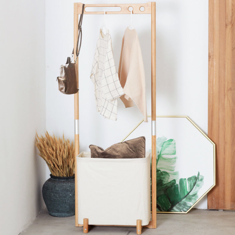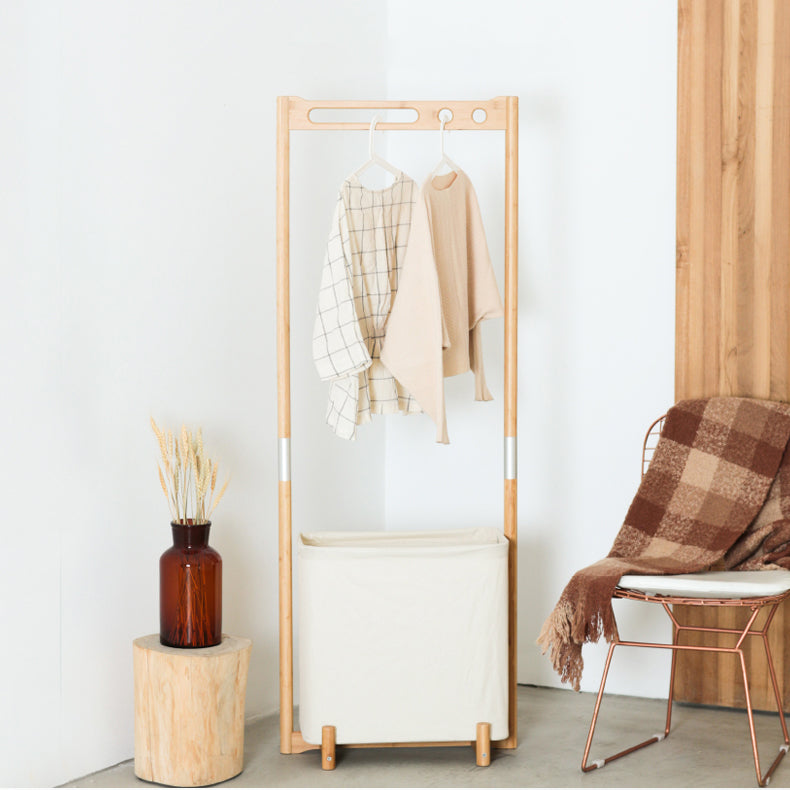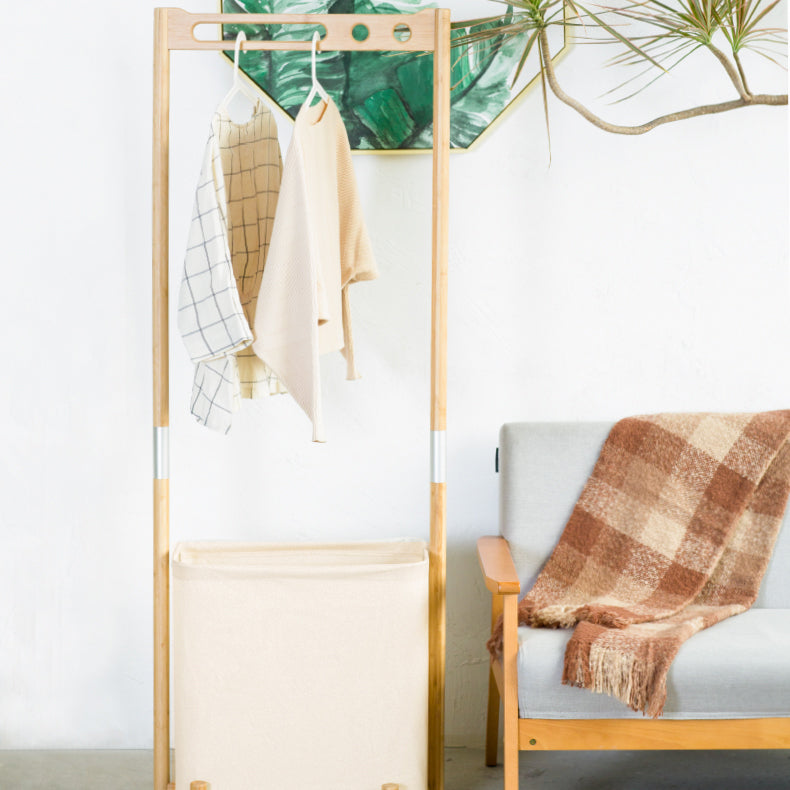 Ce portant à vêtements simple offre un espace de rangement idéal. Idéal dans l'entrée ou à côté du lit, il est doté de deux assemblages métalliques robustes, couleur bois naturel, pour une polyvalence et une qualité irréprochables. Sa finition s'harmonise avec la plupart des intérieurs et rehausse son charme. Sa base en forme de H renforce la surface de contact avec le sol et assure un bon équilibre. Grâce à cette caractéristique, il peut être utilisé presque partout. Un panier de rangement pliable, étanche et résistant, complète parfaitement ce portant.