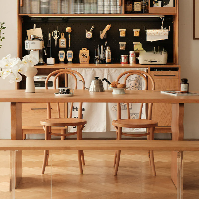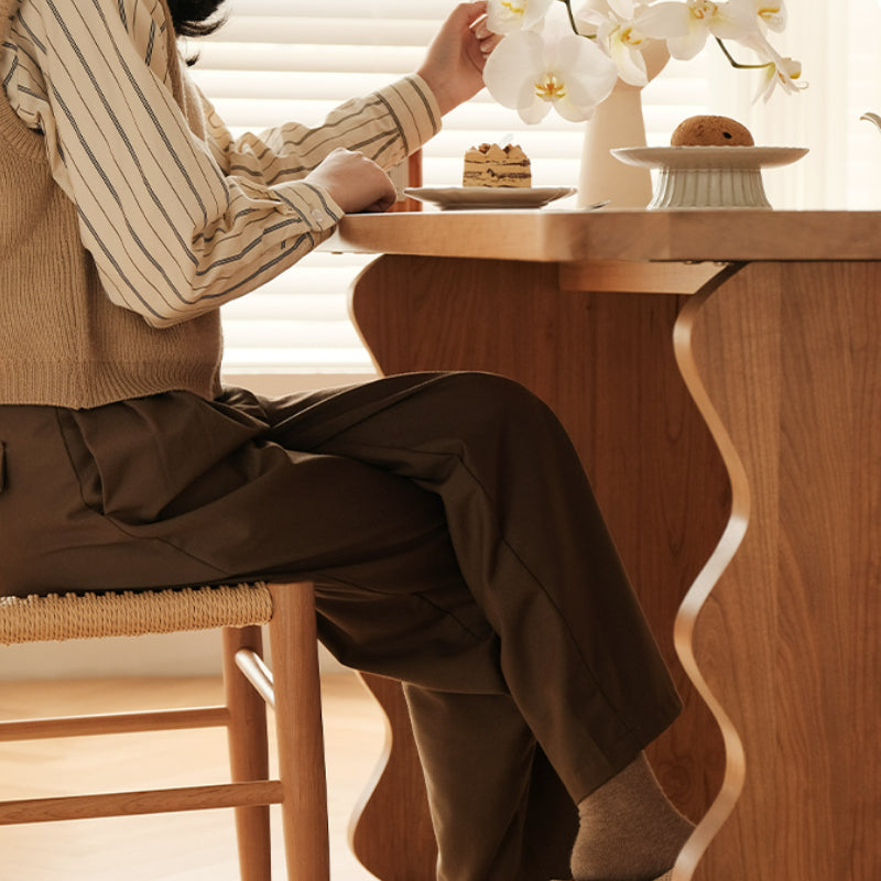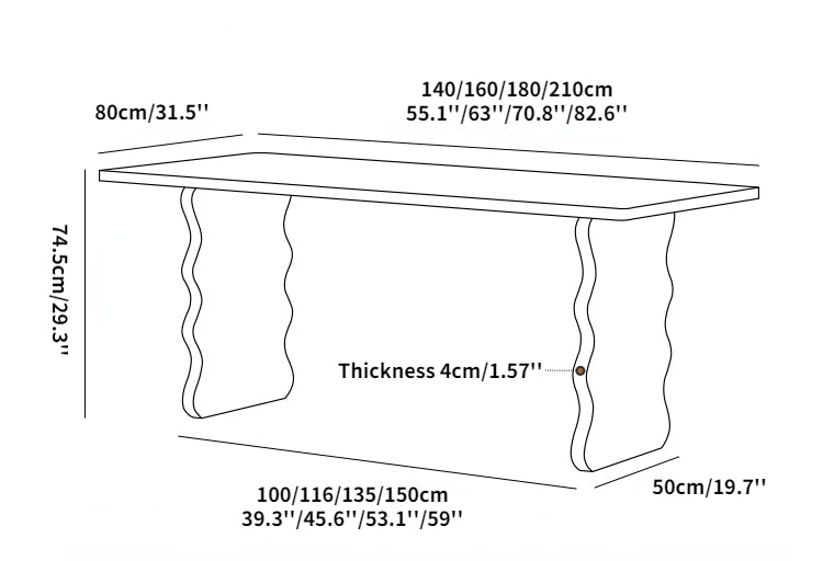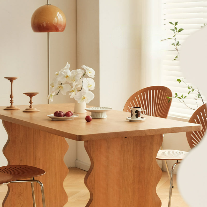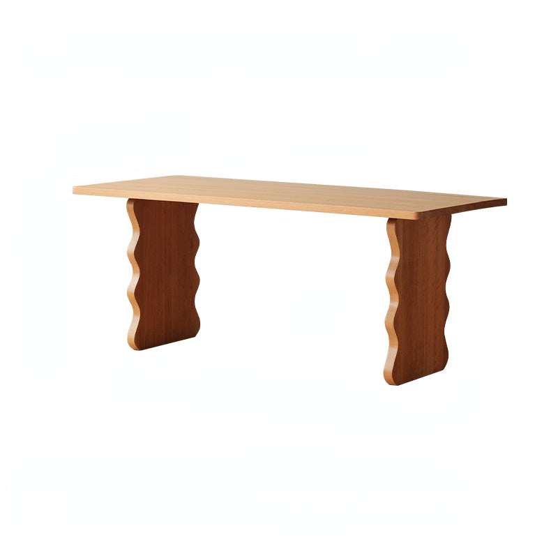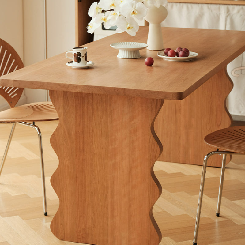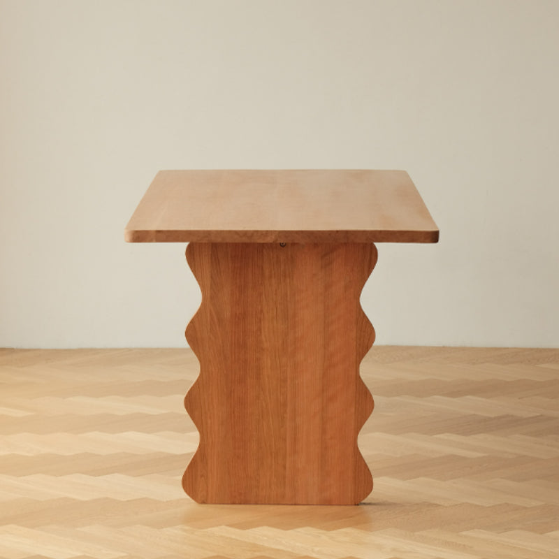 Il s'agit d'une table à manger ondulée d'aspect très artistique, l'ensemble est fait de bois de cerisier de haute qualité, un plateau en bois massif de 2,8 cm d'épaisseur combiné à deux planches de support de base ondulées de 4 cm d'épaisseur, très robustes et solides, et peut accueillir environ 6 à 8 personnes, 4 tailles pour répondre à une variété de types d'appartements, qu'il s'agisse de dîner, de travail, d'études ou de loisirs, et de divertissement sont très appropriées.