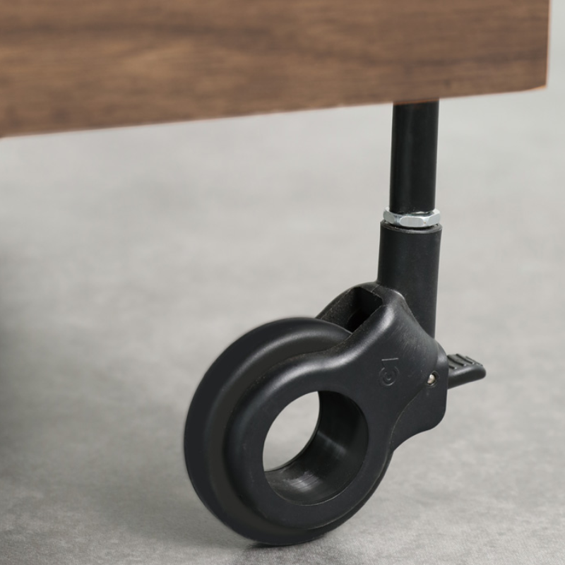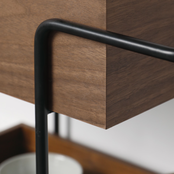 Embellissez votre cuisine et votre salle à manger avec ce chariot de cuisine polyvalent. Il offre un espace de rangement spacieux grâce à ses deux paniers et est monté sur roulettes pour une mobilité optimale. Sa structure est en fer massif et MDF avec une finition noyer foncé.