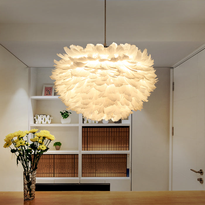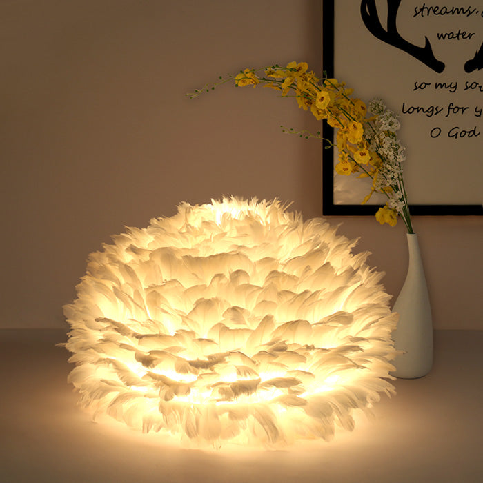 Cette collection est confectionnée à partir de milliers de plumes d'oie recyclées, chacune soigneusement cousue à la main sur son noyau sphérique. Ce globe duveteux diffuse une douce lumière ambiante, s'imposant où qu'il soit placé. Même éteinte, cette suspension est envoûtante ; véritable collaboration entre savoir-faire et art.